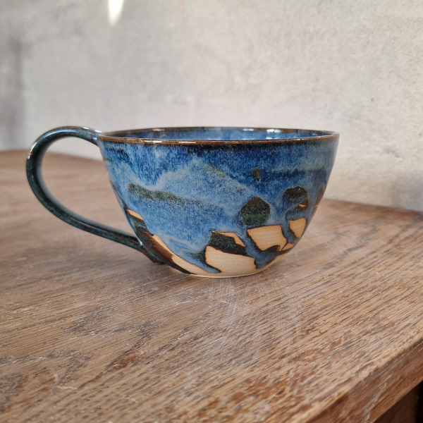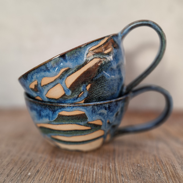 Et hånddrejet tekrus med en åben, rund form og et behageligt, let buet håndtag. Glasuren er et levende blå-splash, hvor dybe blå nuancer flyder hen over den rå lerbund i organiske mønstre. De lyse partier fremhæver glasurens bevægelse og giver kruset et markant, naturinspireret udtryk.