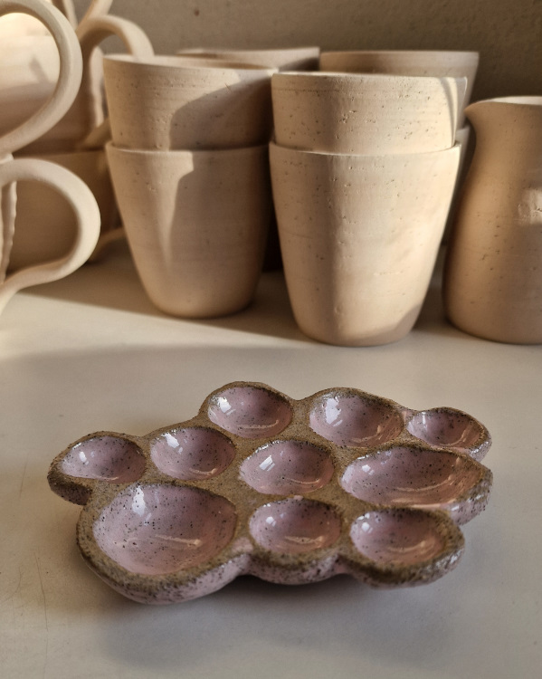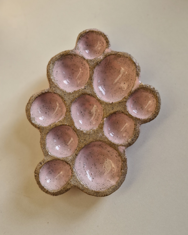 En håndlavet smykkeholder med ti små fordybninger, der hver giver sit eget rum til ringe, øreringe og andre små smykker. Formen er organisk og boblende – som små skåle, der vokser naturligt ind i hinanden og skaber et legende, men roligt udtryk.