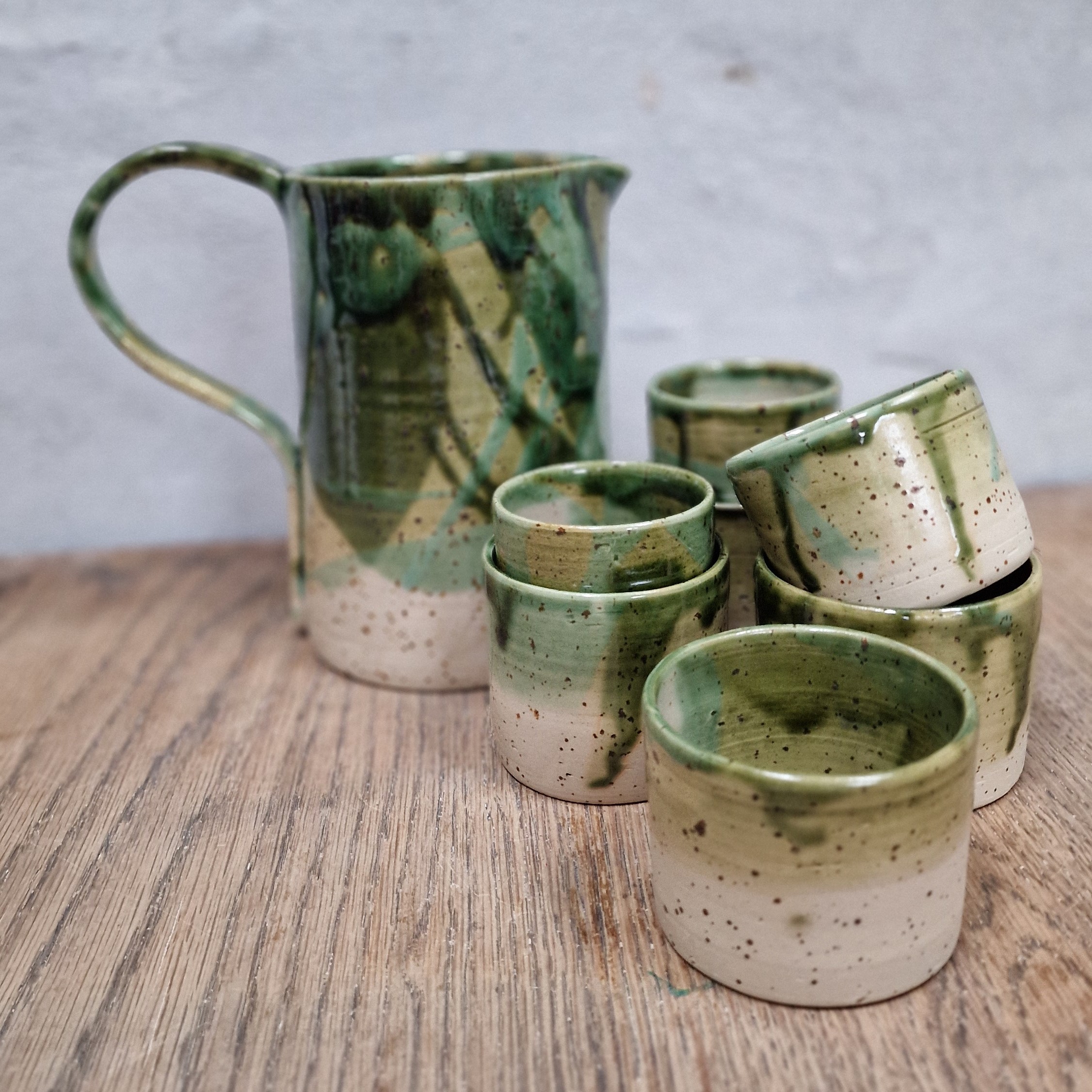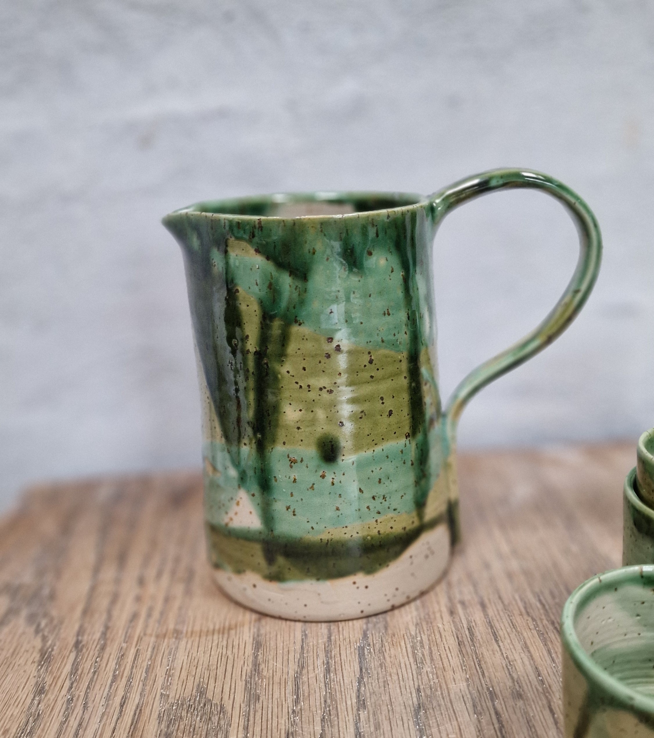 To hånddrejede kander i grønne nuancer, der fanger naturens organiske spil. Glasuren bevæger sig i levende strøg af grøn, beige og mørke løb, som flyder hen over lerets rå, lyse bund. De små lava-pletter giver overfladen karakter og dybde – som mos på sten efter regn.