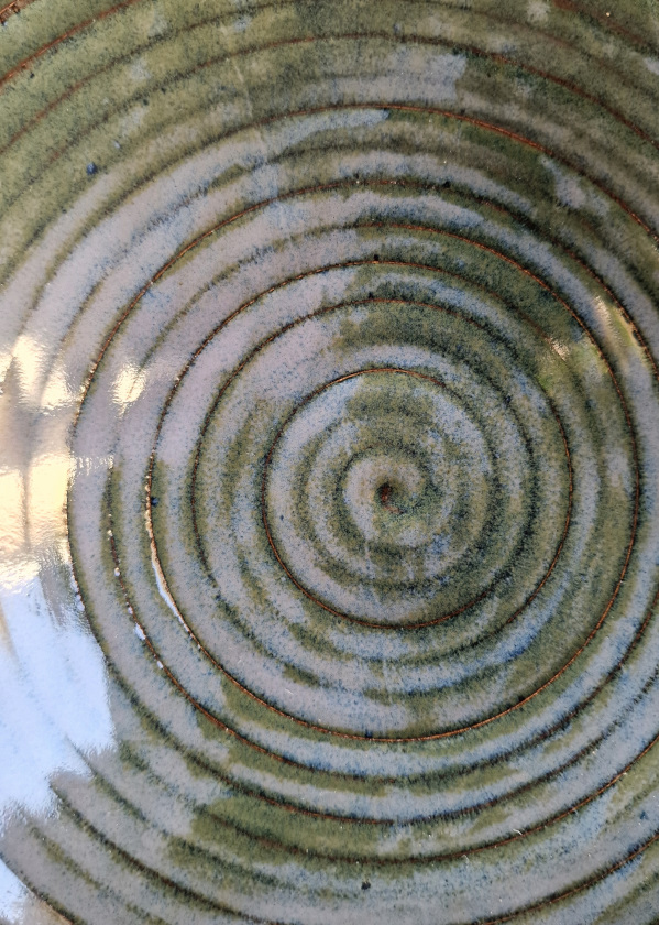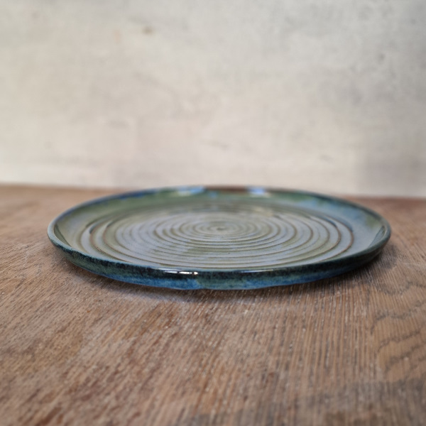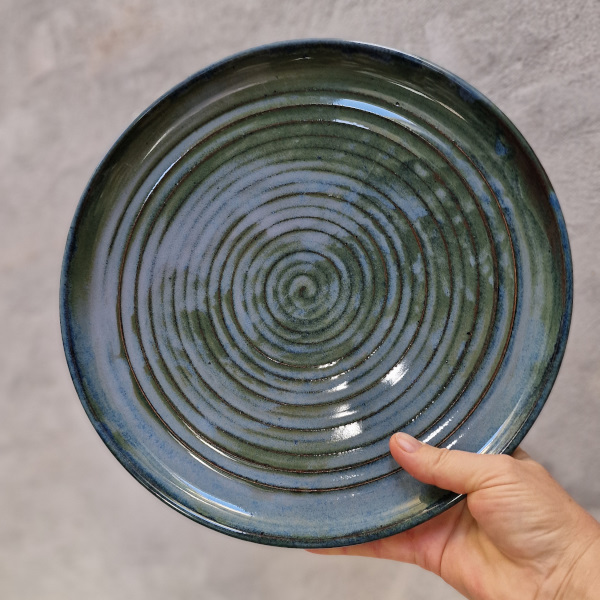 En hånddrejet tallerken med et roligt, dybblåt og grønligt farvespil, hvor glasuren lægger sig i transparente lag over de tydelige drejeriller. Spiralen i midten løfter formen og giver overfladen en stille bevægelse, som bliver ekstra levende i lyset.