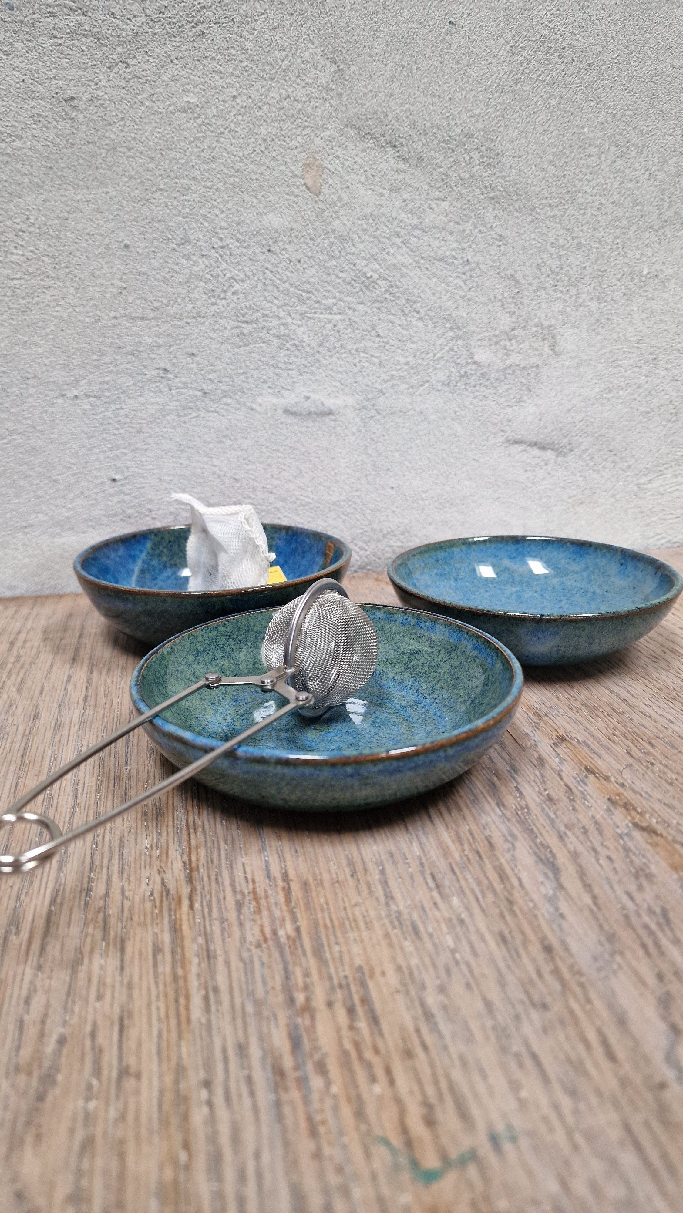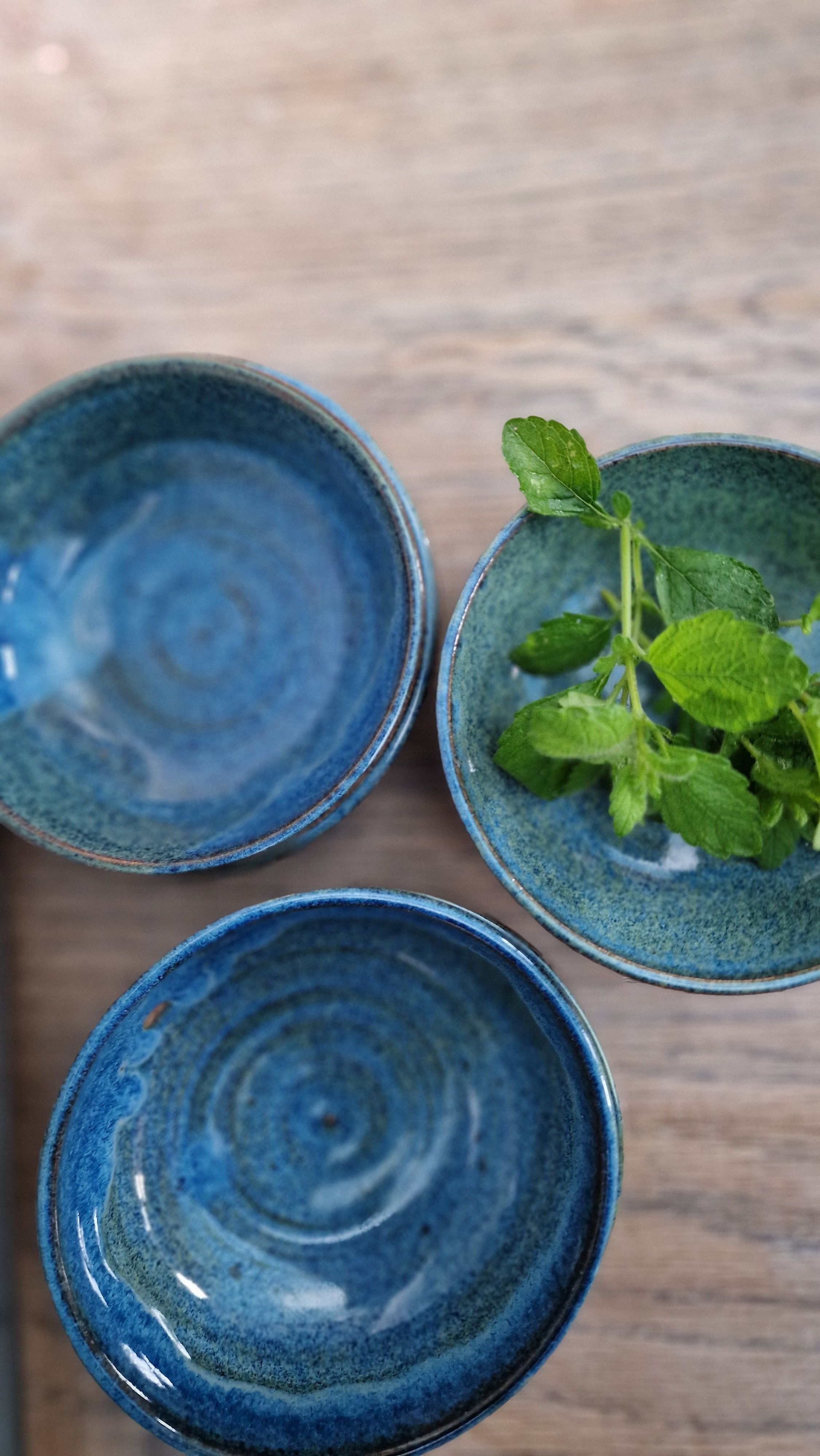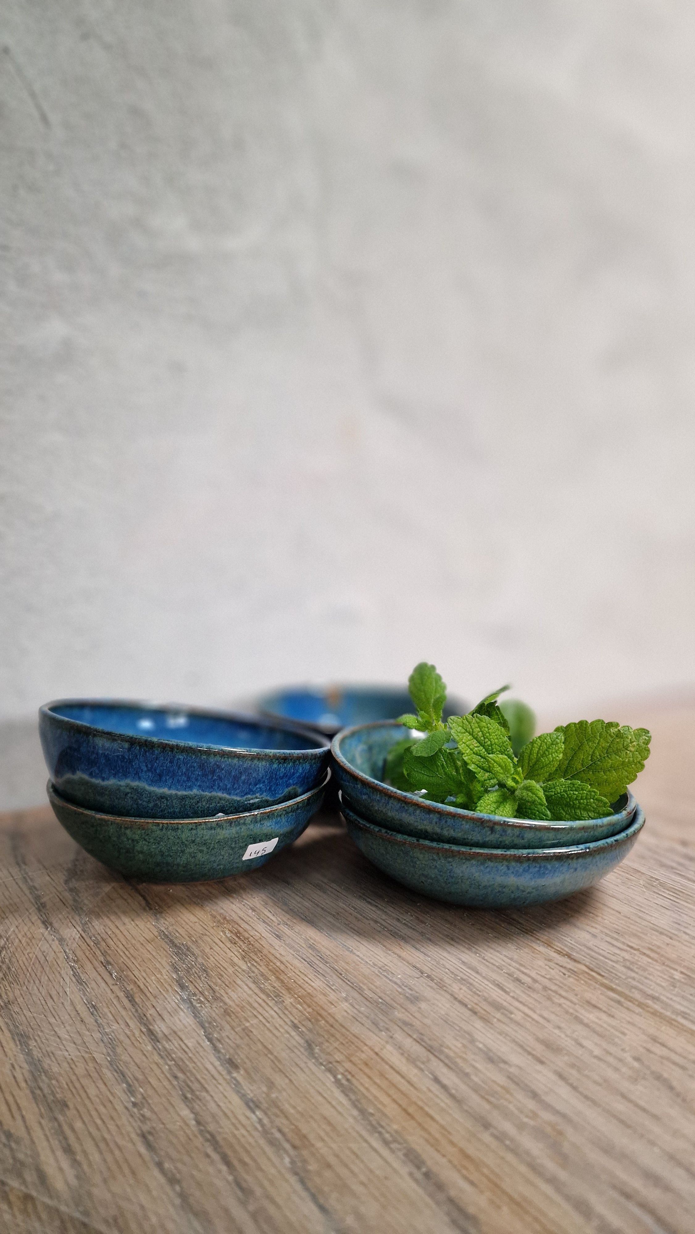 Disse elegante små skåle er perfekte til servering af snacks, dip, børnenes slikskål. Glasuren i dybe blå og grønne toner er blank og ofte ses at glasuren er løbet under brændingen