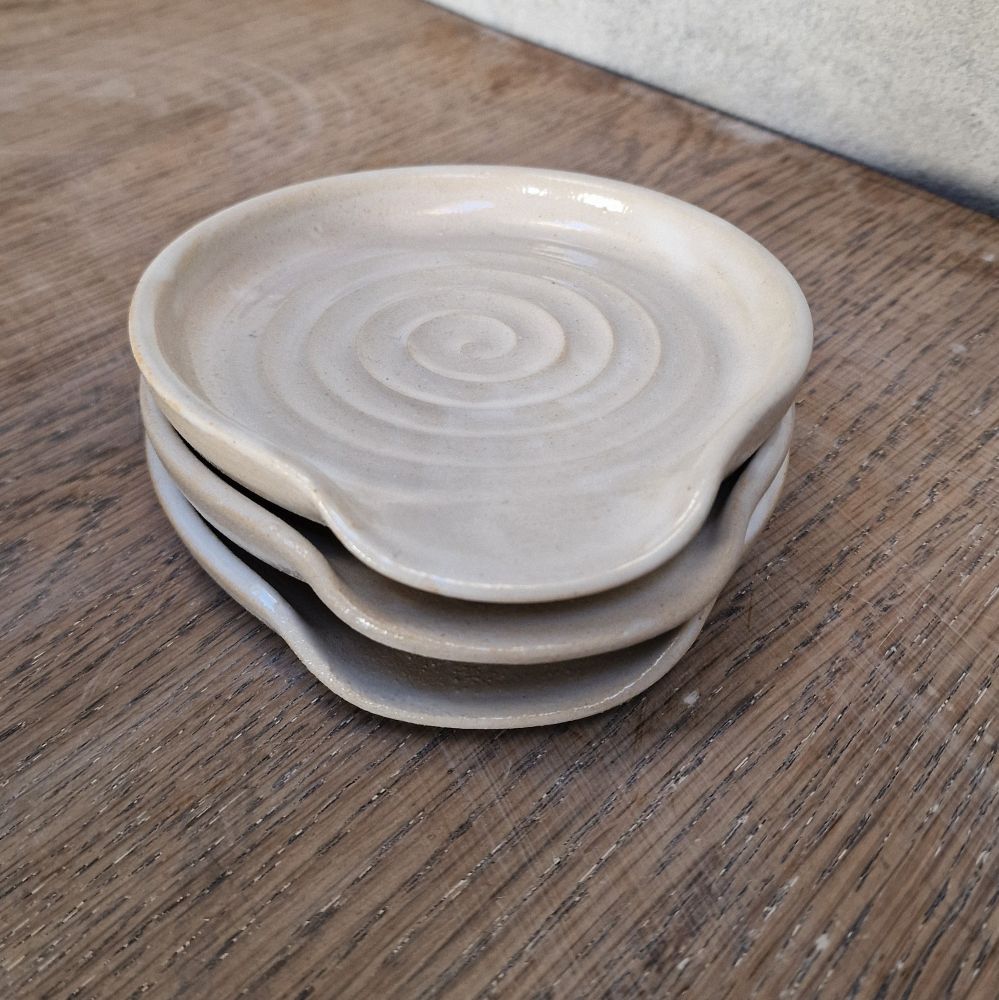 Disse håndlavede spoonrests er lavet i lyst ler og glaseret med hvid glasur.