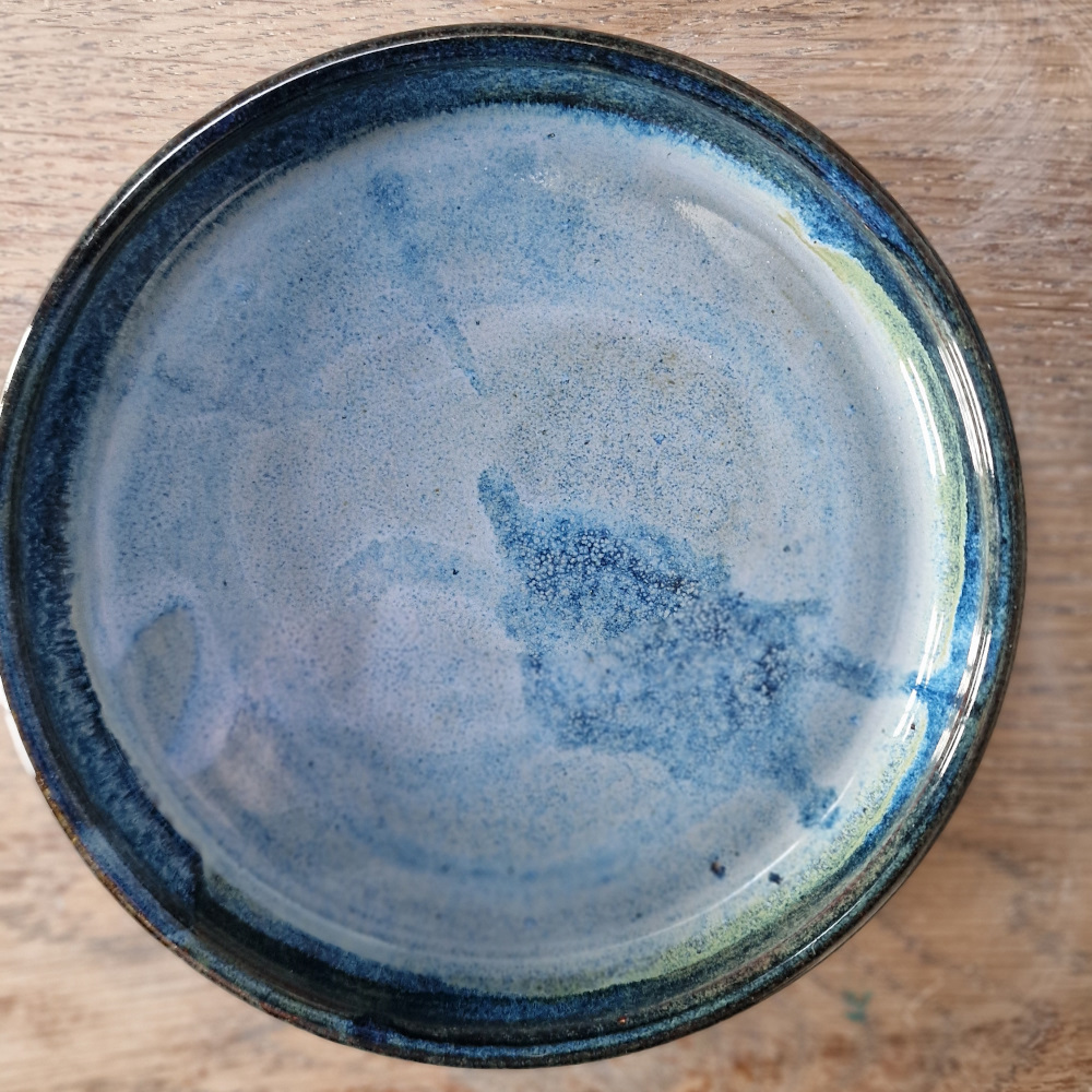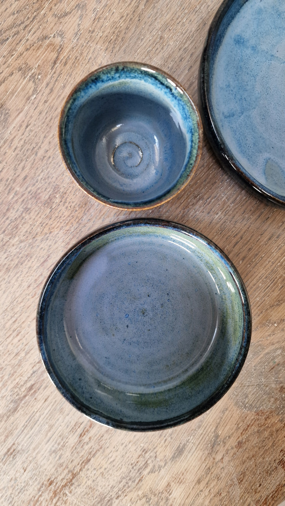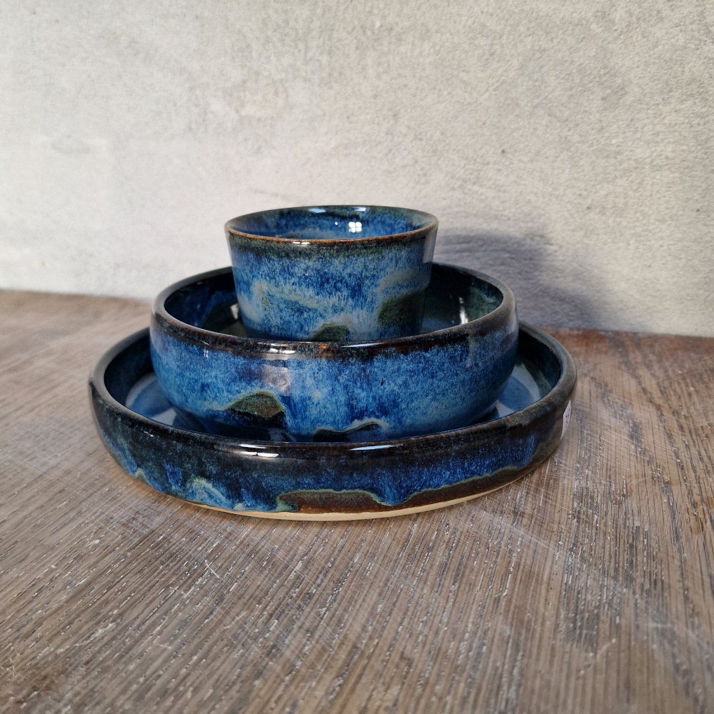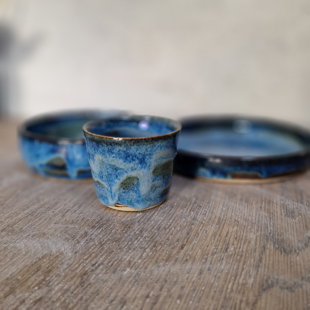 Et håndlavet spisesæt i stentøj, skabt til små hænder og store måltidsøjeblikke. Glasuren bevæger sig i dybblå og havgrønne nuancer med bløde overgange og naturligt farvespil – som vand, der møder strand.